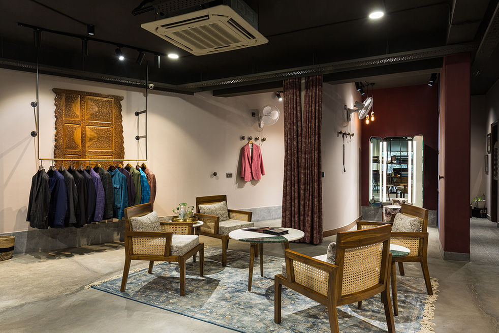 The central display unit was anchored with hidden fixing details to the ceiling and floor and the central portion of it was used for display and floating drawers. The Clear height of 9’6” made us go for an open ceiling with exposed services and track lighting to maintain a sense of space. We used 4000k COB track lights with a high CRI for good color reproduction of the fabrics as a base lighting strategy.